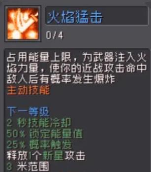 向武器中注入火焰伤害,使你的近战攻击在击中敌人时有机会爆炸,对周围区域造成大量伤害。