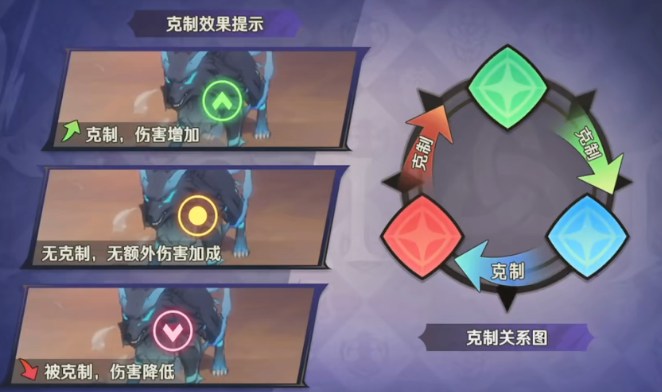 1.游戏中目前有红、绿、蓝三种属性。三者相互制约,形成循环。攻击被克制属性的对手时,可造成20%的伤害,被克制时会造成20%的伤害。伤害减少10%