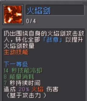 投掷火焰剑对周围造成伤害。斗气可以增加火焰剑的数量。