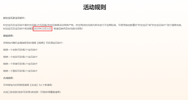 2、达到指定数量的“时空宝石”或“时空宝石碎片”可兑换道具。时空宝石和宝石碎片有效期至2023年12月31日,请召唤者及时兑换领取!