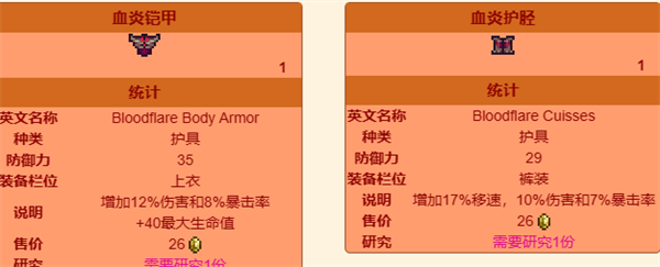 1.这是月亮领主用鸡血石核和毁灭之灵打造的护具。如果想要获得血焰套装,那么玩家需要收集40个血石核心和9个毁灭之灵。