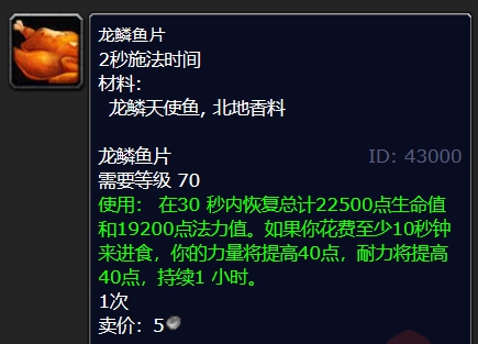 2.龙鳞鱼片:30秒内总共恢复22,500点生命值和19,200点法力值。如果你花费至少10秒进食,你的力量将增加40点,你的耐力将增加40点,持续1小时。