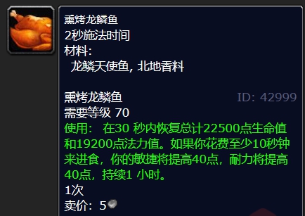 3.烤龙鳞鱼:30秒内总共恢复22,500点生命值和19,200点法力值。如果你花费至少10秒进食,你的敏捷将增加40点,你的体力将增加40点,持续1小时。