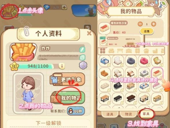 通过出售多种家具来获得金币,同时,有金币奖励角色升级和移动。