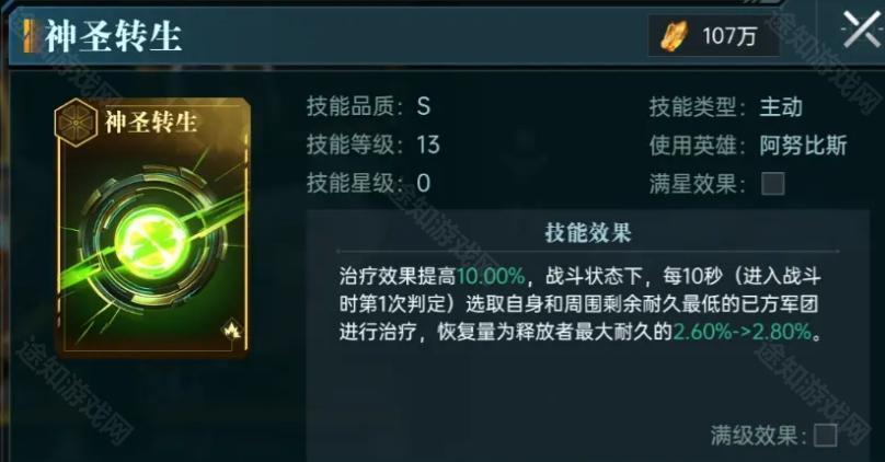 核心技能“神圣的转世”改善了愈合效果,并每10秒选择自己和周围的军团中最低的耐用性团队进行康复。技能效应非常简单,主要是提供康复。