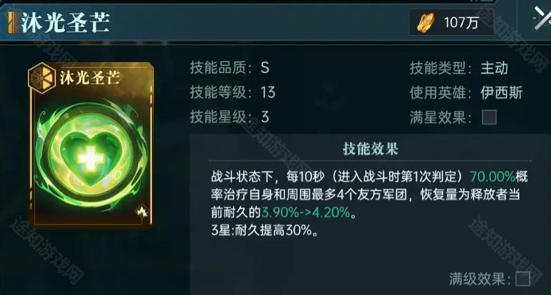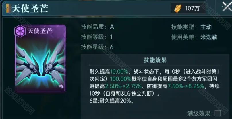 核心技能“天使圣光”提高了其耐用性,同时每10秒就增加了自己和周围的军团道奇率和防御属性。因为它是紫色的英雄,所以很容易充满星星。完整的星星之后,概率将增加到100,这意味着可以稳定地提供属性奖金。