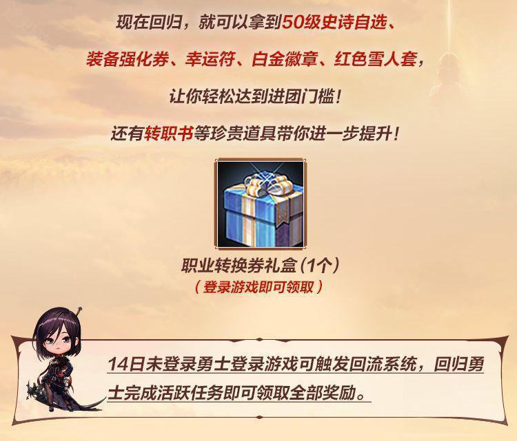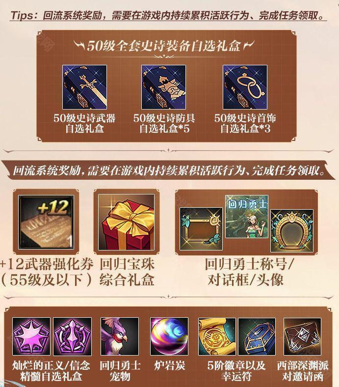 返回系统的好处即将到来。返回的球员参加了活动。积极地,您可以收到完整的50级史诗和大量耕种资源,以确保返回战士的快速增长。