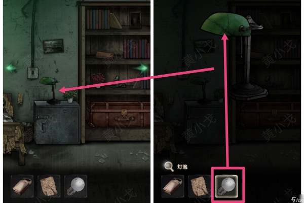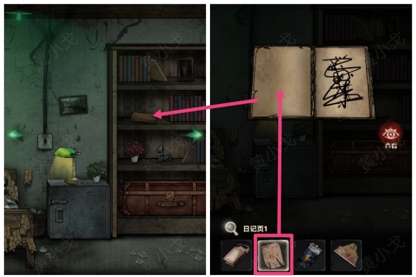 6.打开台灯以获取钥匙和电池,然后转到书架上,将发现的日记放在书架上以获取线索。