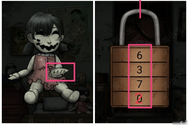 9。单击床上的洋娃娃,用针和线缝制她的线索,然后单击门上桌子上的盒子以输入密码:6327