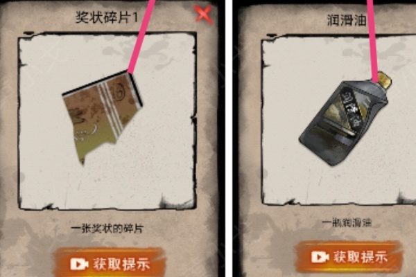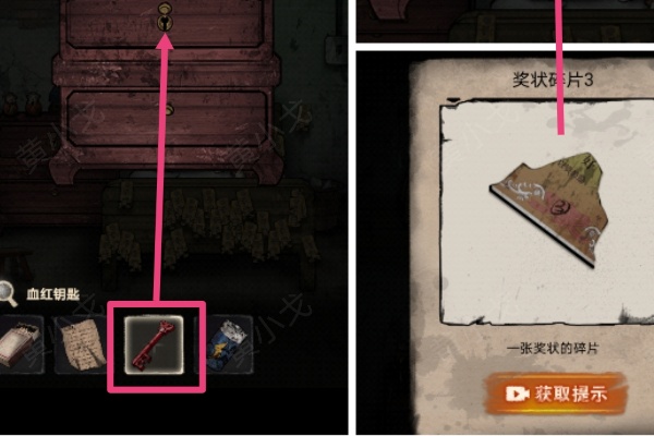 10。获得日记页面和胶卷后,单击机柜上的手提箱,用黑色钥匙打开它,以获取证书片段和润滑油。