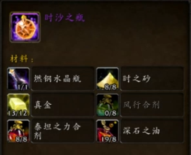 2。打开它后,我们可以制作时间砂瓶,它需要1个燃烧的水晶瓶,8个时砂,12个真金,8个风水混合物,8个泰坦电源混合物和8块深石油。