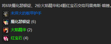 魔兽世界中未Quenched的板装甲手套是我们将在燃油板装甲手套任务中获得的任务项目。如果您将此物品和相应的材料交给Marreforth Dark Hammer,玩家可以获取燃烧的板甲手套及其设计图纸。