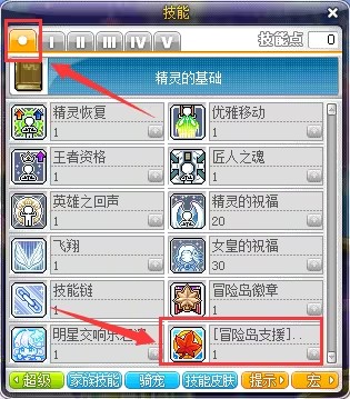 2。如果打开技能界面,请在左上角输入圆圈,然后在右下角打开“冒险岛支撑”。