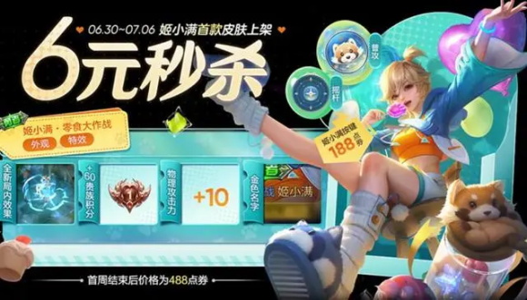 季小曼上线有一段时间了。此次,季小曼的首款皮肤也将同步上架。它被命名为《Snack Fight》,定位为英雄。该皮肤首周(6月30日-7月6日)仅需60点券,首周后恢复原价488点券。同时,这款皮肤上架后,也会进入碎片商店。届时,玩家还可以使用48个皮肤碎片来兑换这款皮肤。