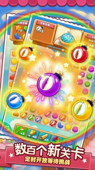 在缤纷色彩的融合下,打造出一款糖果消除游戏。消除三个相同颜色的糖果以获得更高的分数。每次消除后都会有新的随机填充糖果的颜色会产生各种连锁反应,宝石和软糖不断,还有消除糖果,七彩特效,各种光粒子和颜色之间的爆冷效果.