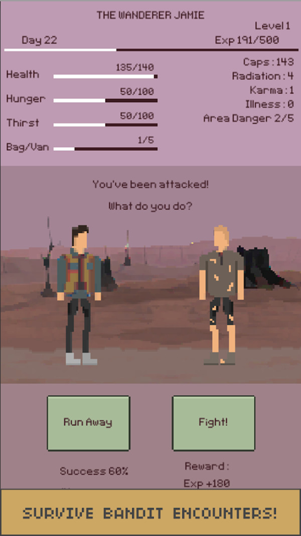 在《求生流浪者》游戏中,玩家将通过文字在一片废土中生存,收集资源制作武器装备,利用生存技能努力生存,不断升级武器来抵御一切外来海盗的攻击。超高的玩法自由度和丰富的游戏内容,让你享受属于自己的生存之旅。
